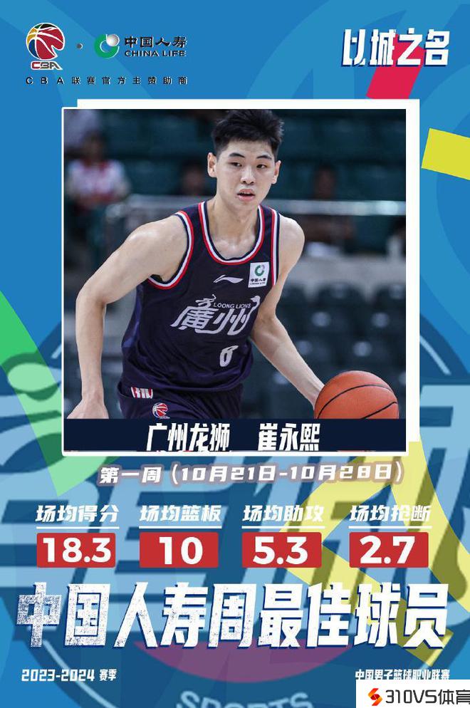 CBA官宣首周周最佳:崔永熙初次获奖率广州高居第一 利夫中选