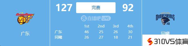同曦队92-127大比分落败,广东队在首节便狂轰46分奠定胜局。