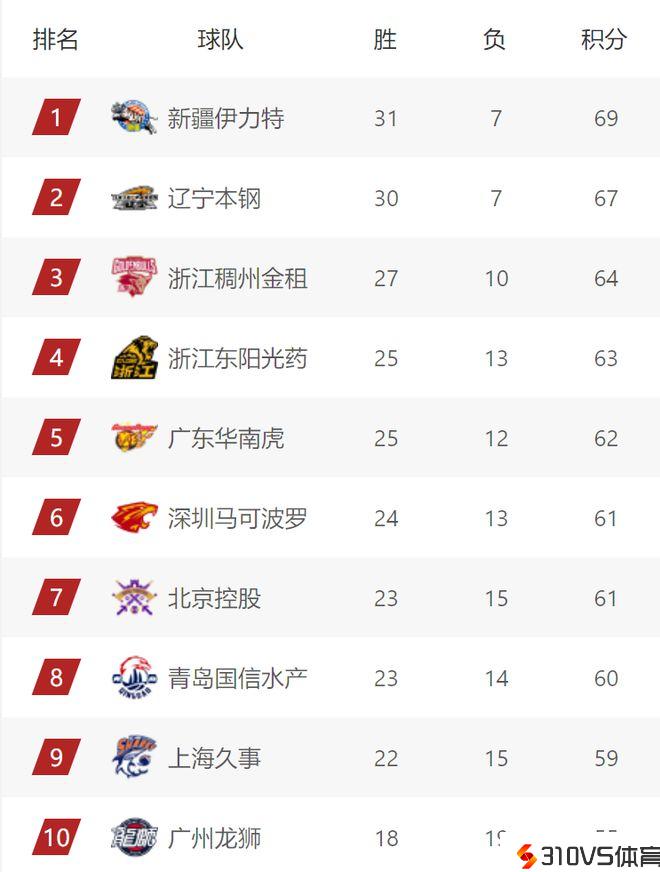 CBA惯例赛积分榜(截至2月2日)