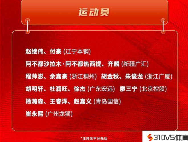 集训16人名单包括:赵继伟、付豪、阿不都沙拉木、齐麟、程帅澎、余嘉豪、胡金秋、朱俊龙、胡明轩、杜润旺、徐杰、廖三宁、杨瀚森、王睿泽、赵嘉义、崔永熙。
