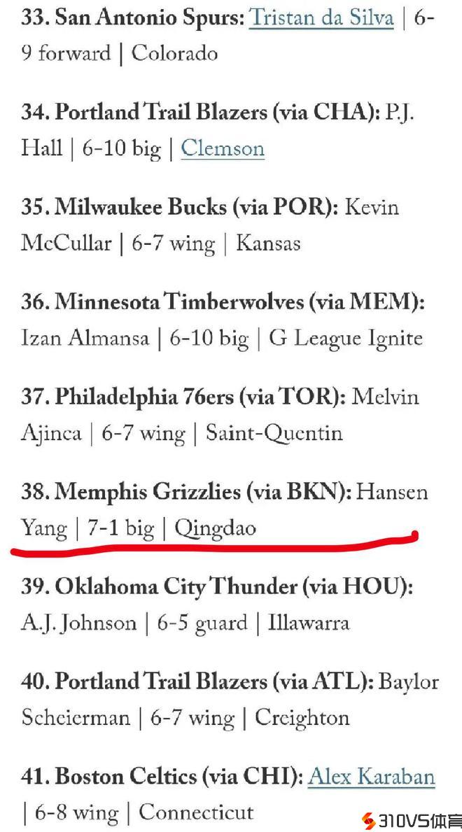 此前杨瀚森也曾在其他选秀网站上榜,最高排名去到首轮第27顺位,而The Athletic是极为威望的选秀网站,此番第38顺位的预测愈加契合杨瀚森目前的形状。