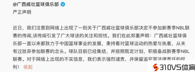 为此广西威壮官方亲身下场停止造谣,谴责造谣者,同时保管法律清查责任,并强调球队正在备战新赛季的NBL联赛,详细是说:“我们在此郑重声明:广西威壮篮球俱乐部不时以来都努力于中国篮球事业的开展,秉持着对篮球运动的热爱与执着,从未有过坚持参与联赛的念头。关于网络上出现的不实信息,我们表示剧烈谴责,并保管清查其法律责任的权益!”