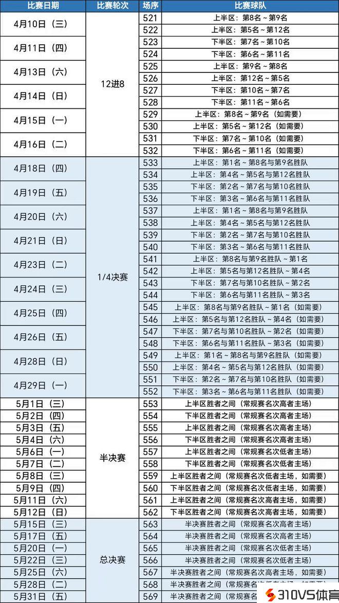 3月20日,CBA发布本赛季季后赛日程,季后赛4月10日开打,总决赛5月15日开打。积分榜前12名进入季后赛。