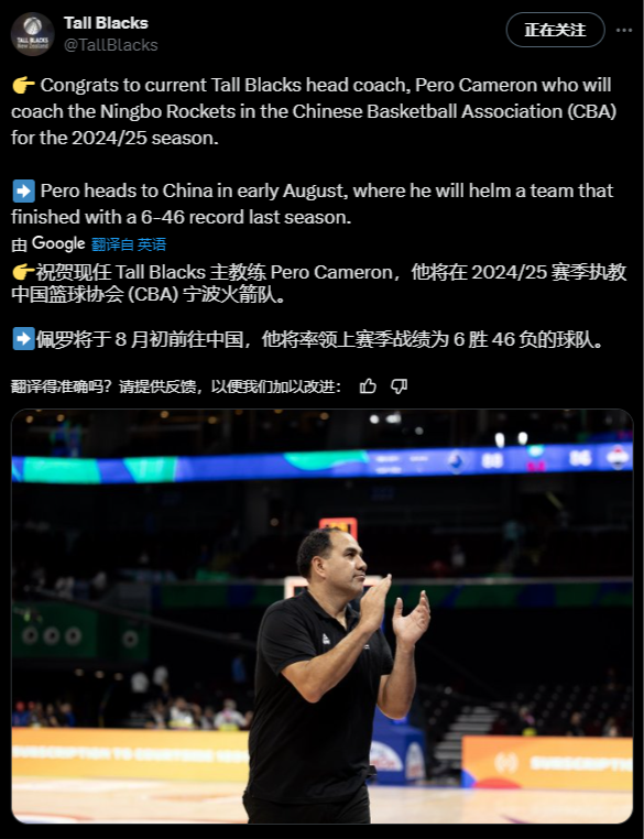 宁波男篮迎来新主帅,前新西兰国家队主教练佩罗-卡梅隆24-25赛季将来到CBA执教。