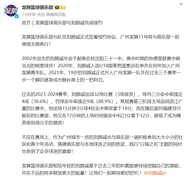 官方|龙狮篮球俱乐部与刘颜诚完成续约