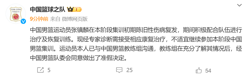 中国男篮运动员张镇麟在本阶段集训初期陈旧性伤病复发,期间积极配合队伍进行治疗及恢复训练。现经专家诊断需接受相应康复治疗,不适宜继续参加本阶段中国男篮集训。运动员本人已与中国男篮教练组沟通,教练组在充分了解其情况后,经中国男篮队委会同意做出了准假决定。