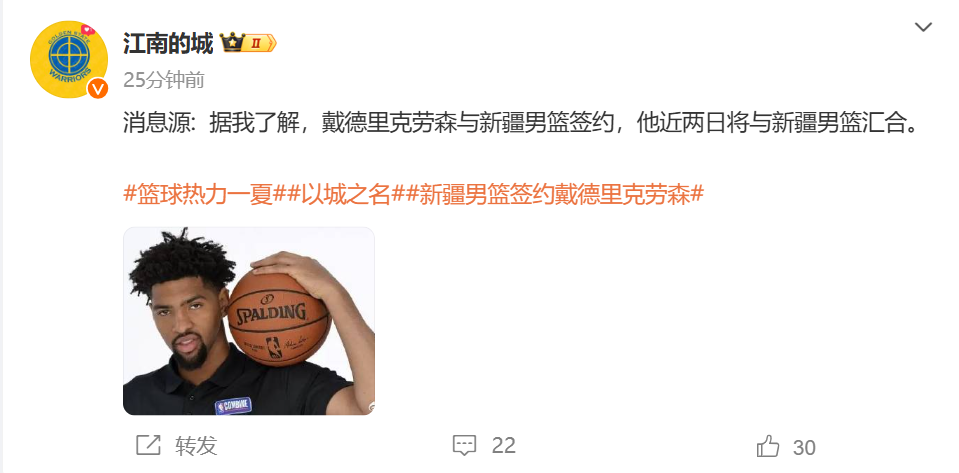 “消息源: 据我了解,戴德里克劳森与新疆男篮签约,他近两日将与新疆男篮汇合。”
