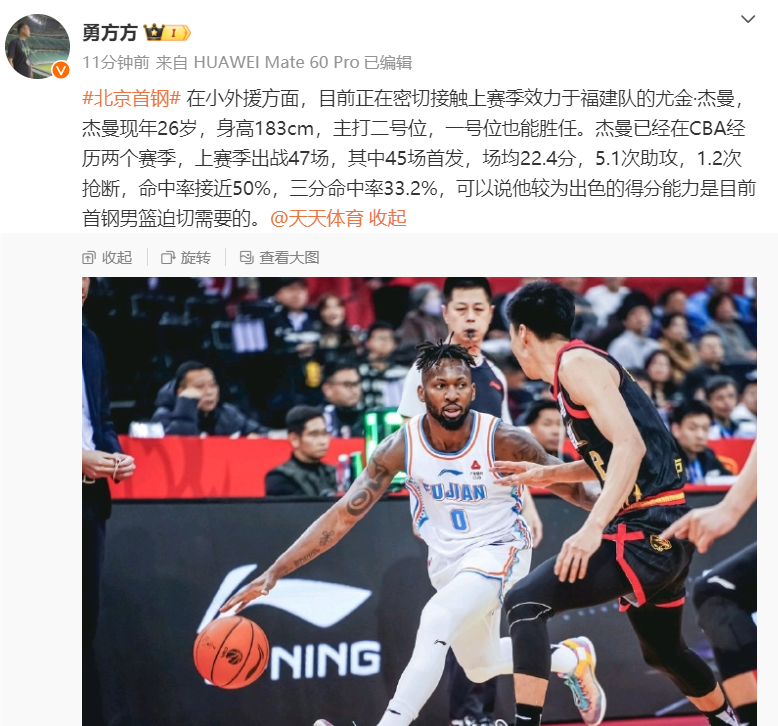 北京时间8月16日,据北京媒体人勇方方透露,北京首钢男篮正密切接触上赛季效力于福建男篮的小外援尤金-杰曼。勇方方的原文内容如下:
