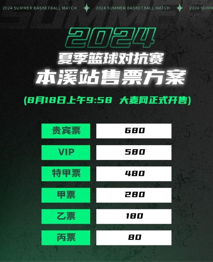 本溪站比赛的门票将于18日9时58分在大麦网开始销售,喜欢辽宁男篮的球迷朋友们可千万不要错过哦!具体票价详见下图: