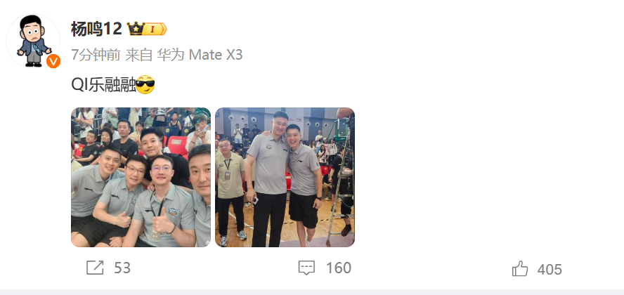 两人热情合影,杨鸣在社媒也配文,QI乐融融。