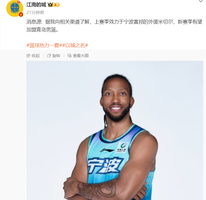北京时间8月24日,据媒体人“江南的城”透露,上赛季效力于宁波男篮的内线外援米切尔,新赛季有望加盟青岛男篮。