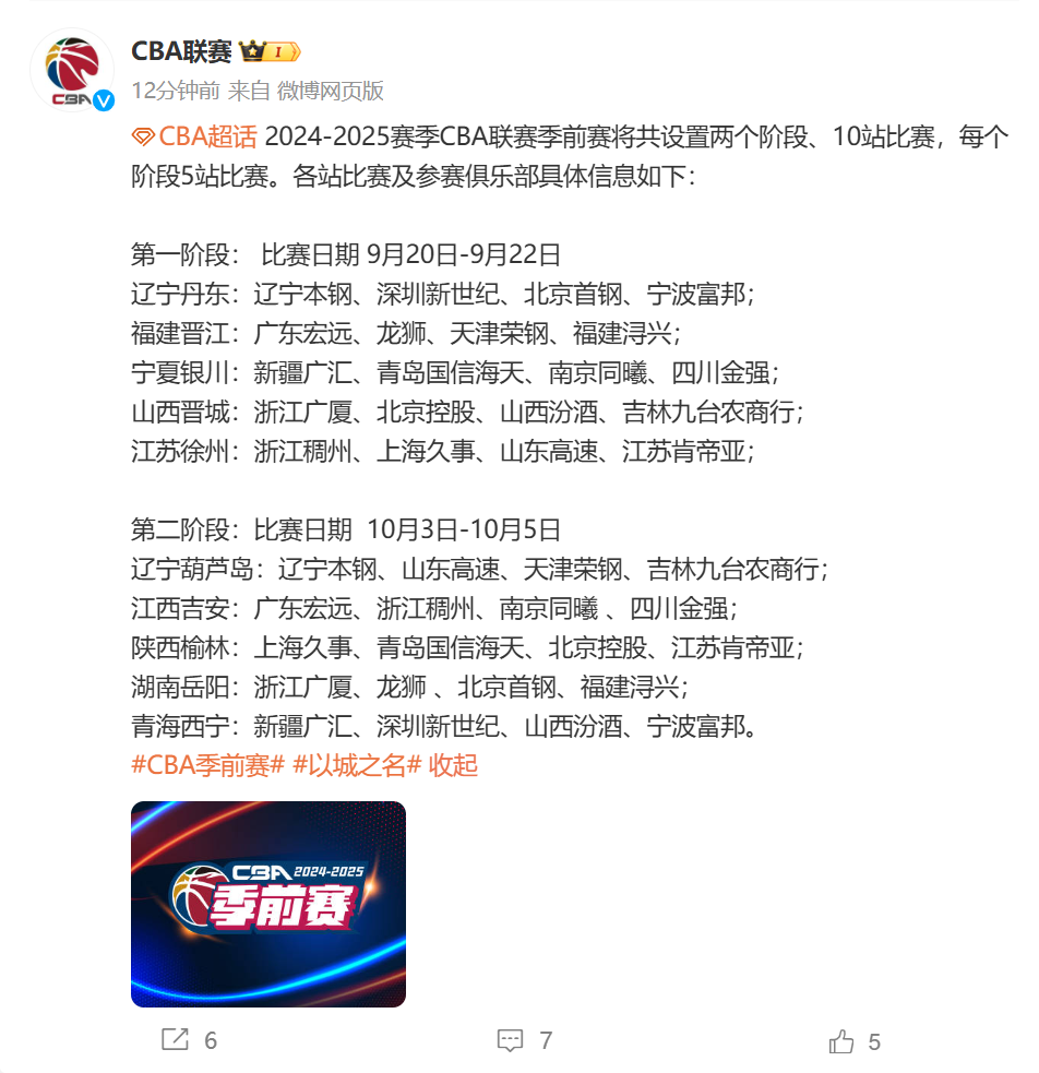 “2024-2025赛季CBA联赛季前赛将共设置两个阶段、10站比赛,每个阶段5站比赛。各站比赛及参赛俱乐部具体信息如下: