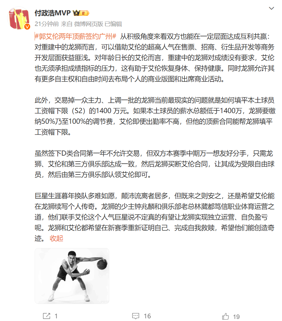 今日,据媒体人球圈赵探长报道,郭艾伦两年顶薪与广州男篮签约,此后资深媒体人付政浩对这次合同进行解释,具体原文如下,