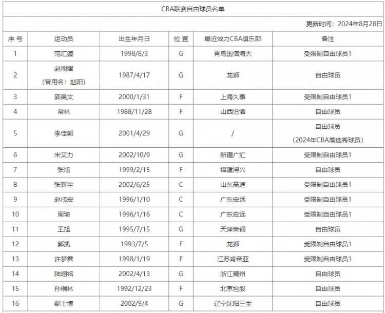 🌟CBA更新自由球员名单:新增郭昊文、常林等