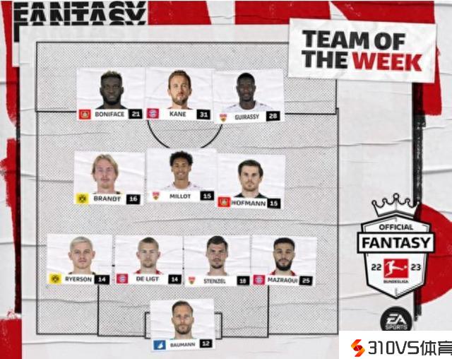 德甲官方评本轮最佳阵:凯恩领衔,德里赫特,布兰特在列