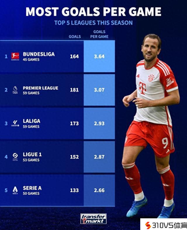 本赛季五大联赛场均进球:德甲3.64球最多,英超次席,意甲最低