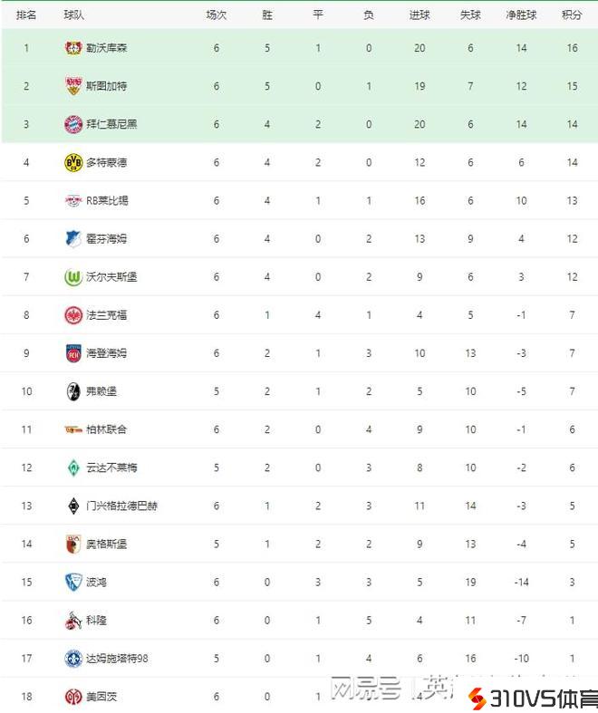 德甲最新积分榜:拜仁战平莱比锡跌至第3,勒沃库森客场大胜登顶