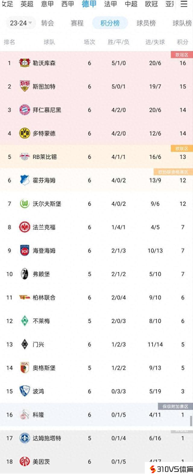 德甲积分榜:勒沃库森5胜1平领跑,拜仁4胜2平排第三