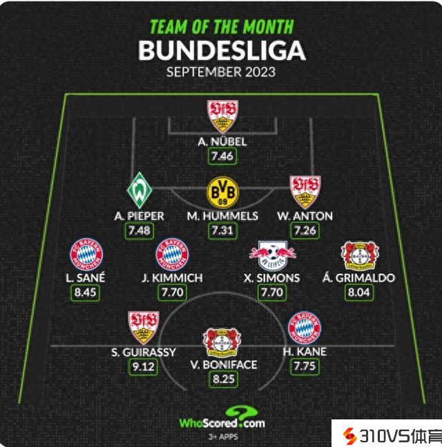 WhoScored德甲9月最佳阵容:凯恩、基米希、萨内、吉拉西在列