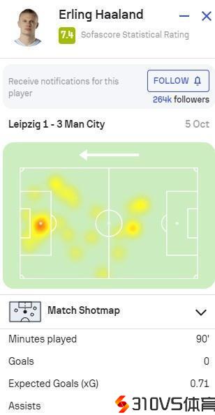 哈兰德本场对阵莱比锡数据:2射正1关键传球,SofaScore评分7.4