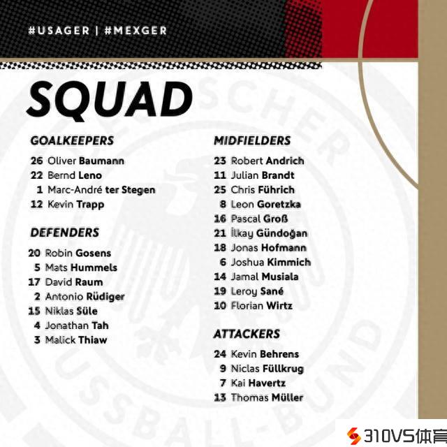德国国度队发布了球队国际竞赛日时期美国行的大名单,他们将先后对阵美国和墨西哥。