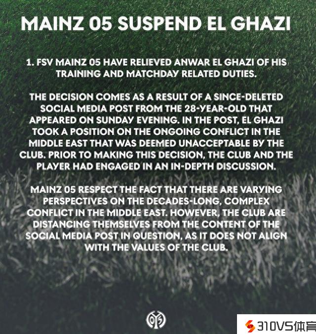 俱乐部官方声明中表示:“这一决议是基于10月15日一条在社交媒体上曾经被删除的静态的结果。这条帖文中,由于艾尔-加齐对中东正在发作的抵触采取了我们无法接受的立场。在作出这个决议之前,俱乐部和球员都曾经停止了深化的讨论。美因茨尊重这样的一个理想:人们可以对这场复杂、长达数十年的中东抵触拥有不同的看法,不过,俱乐部会和抵触效果坚持距离,由于这并不契合俱乐部的价值观。”