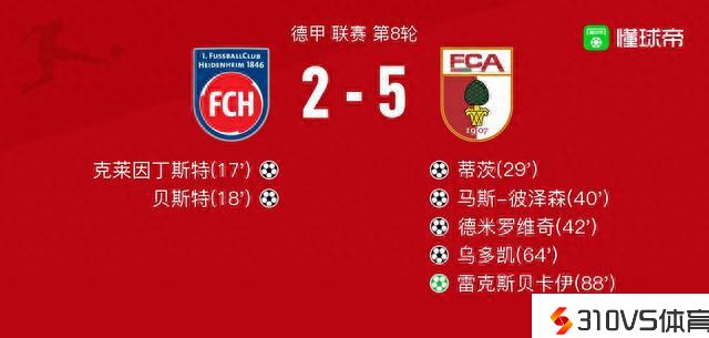 北京时间10月22日德甲 联赛 第8轮,海登海姆主场对阵奥格斯堡。海登海姆克莱因丁斯特破门,贝斯特破门。奥格斯堡蒂茨破门,马斯-彼泽森破门,德米罗维奇破门,乌多凯破门,雷克斯贝卡伊破门。最终比分2-5。
