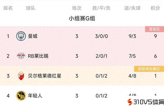 欧冠G组积分榜:曼城3战全胜领跑,莱比锡积6分第二