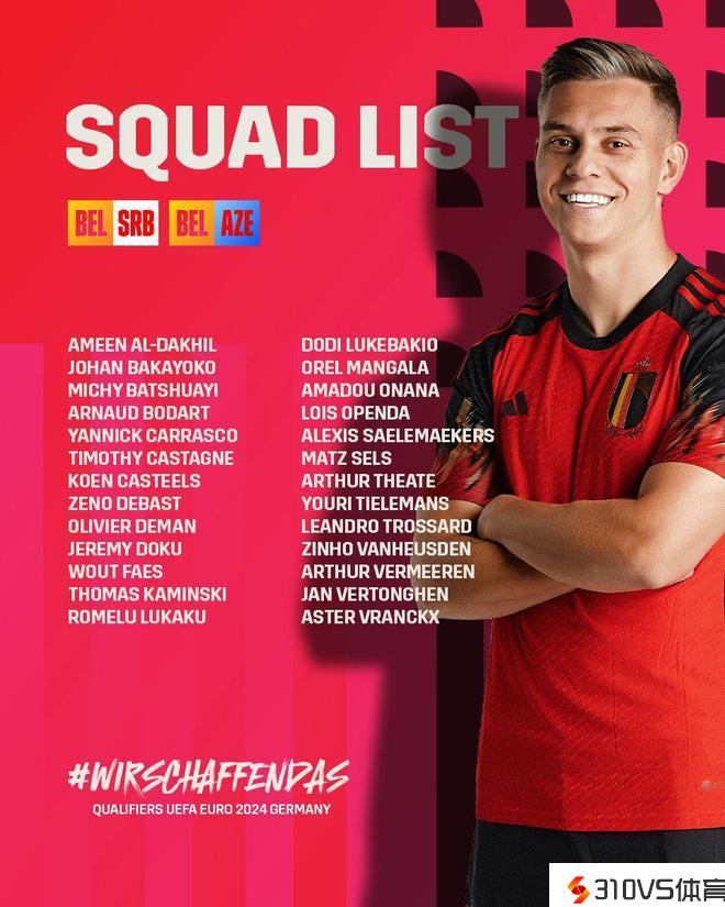 比利时新一期名单发布,卢卡库、多库、特罗萨德、奥蓬达、卡拉斯科等球员中选,18岁中场维尔梅伦在列。
