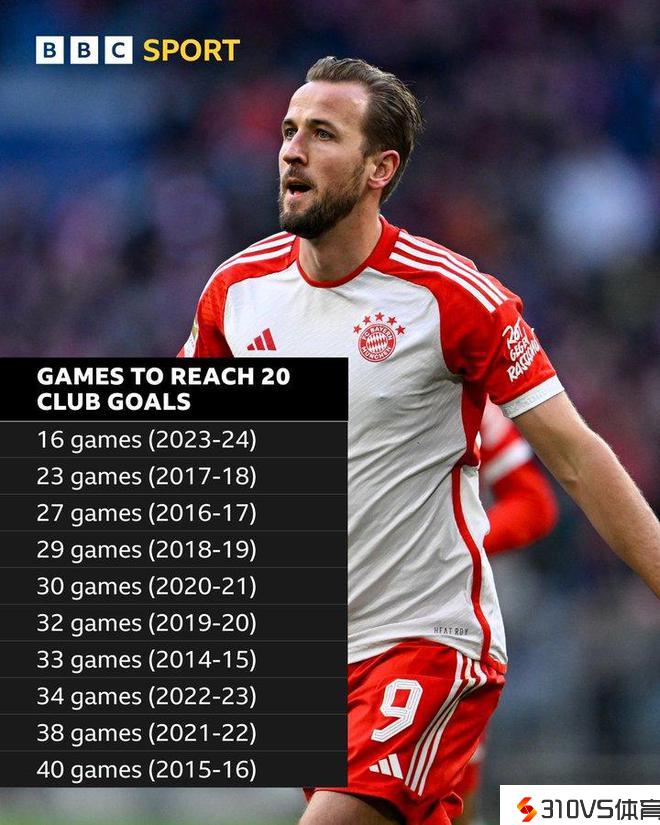 凯恩生涯单赛季达成20球所用时长:本赛季仅16场效率最高