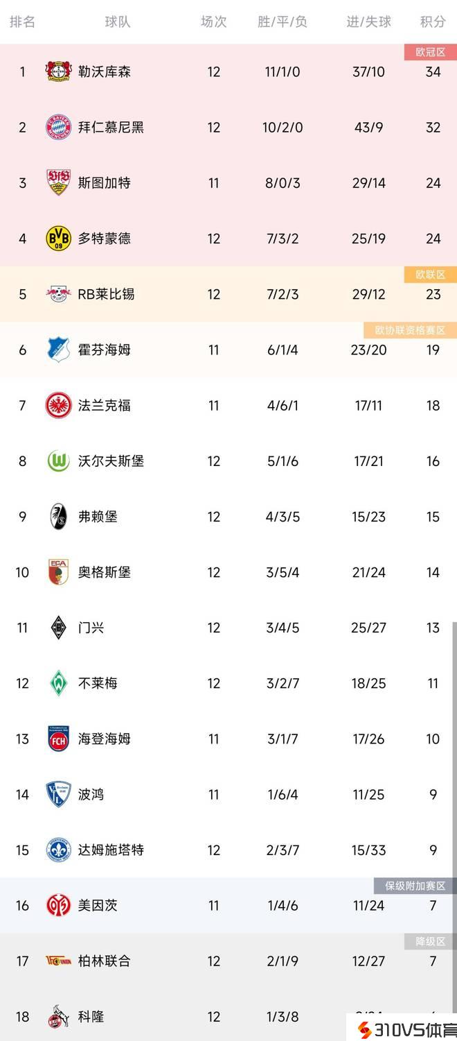 德甲积分榜:药厂联赛8连胜再超拜仁登顶,柏林联终结9连败仍倒二