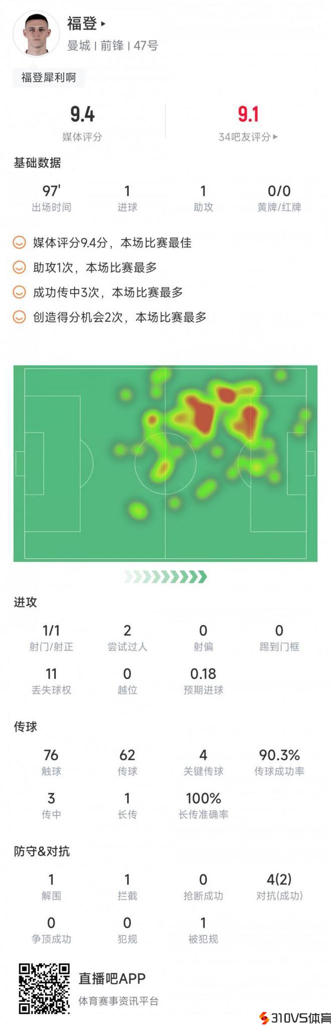 福登对莱比锡数据:传射建功&4次关键传球,评分9.4全场最高