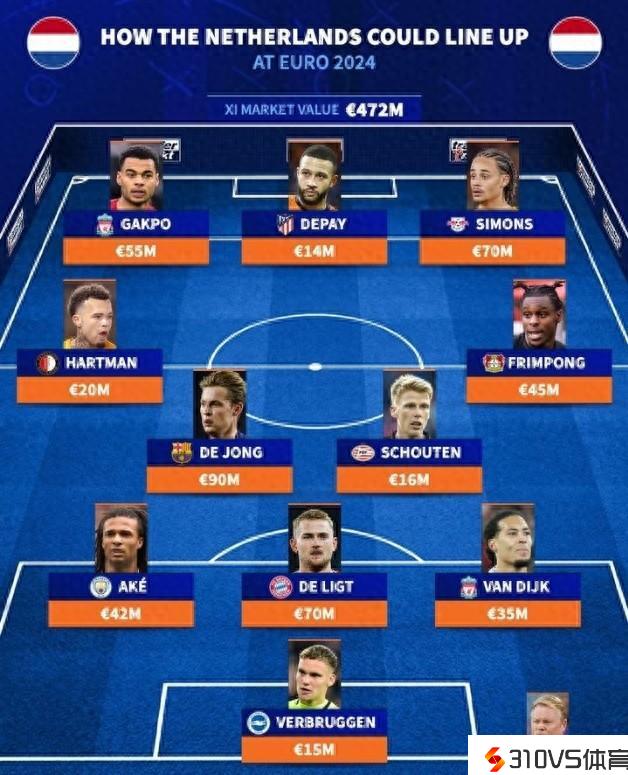 德转预测荷兰队欧洲杯首发:总身价4.72亿欧,德容9000万欧最高