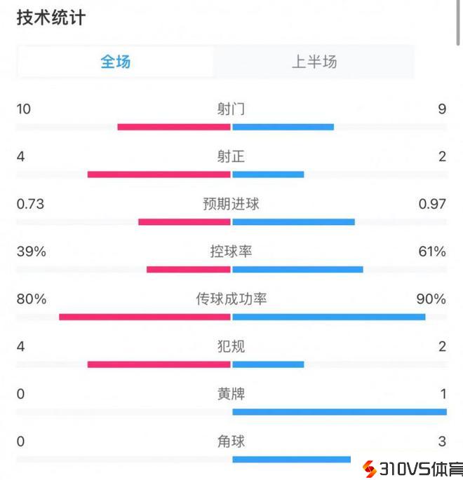 法鹰3-1拜仁半场数据:射门10-9,射正4-2,预期进球0.73-0.97