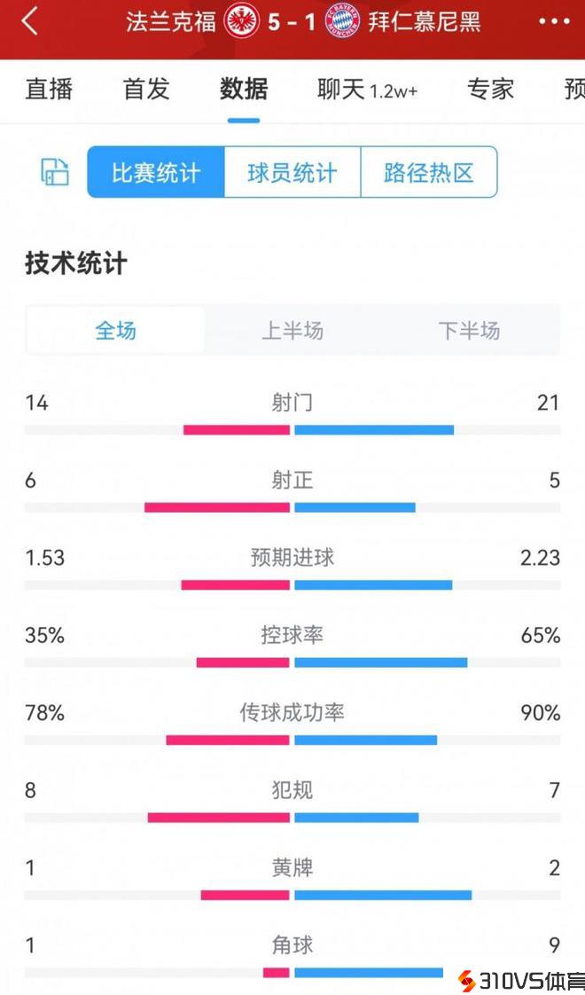 在本轮德甲,拜仁1-5不敌法兰克福,以下为双方全场数据对比: