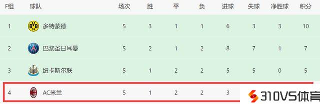 在小组积分榜上,AC米兰以5分垫底,最后一轮,他们做客对阵纽卡斯尔,AC米兰必需击败对手,才无时机出线,无论争平还是输球,他们都将被淘汰,而且也一定无缘欧联杯附加赛。
