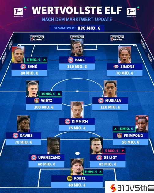 昔日德转更新了局部德甲球员身价,最新一期德甲身价最高阵容出炉,凯恩、维尔茨、穆西亚拉三人身价上亿,总身价8.3亿欧。