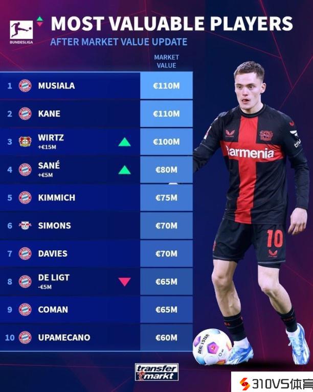 德甲球员身价榜:穆西亚拉、凯恩1.1亿欧最高,维尔茨新亿元先生