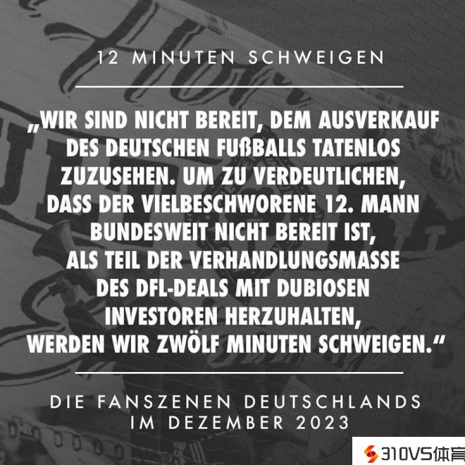 所谓的与基层对话早已成为一句空话,如今我们必需以其他方式让他人听到我们的声响!为了让大家听到我们的声响,我们以缄默抗议,至少在下轮竞赛的前12分钟不会说话。对德国足球出卖自己的行为,我们不会袖手旁观,这是为了让大家清楚地看法到,备受推崇的德国足球第12人并不预备成为德国足球与可疑投资者买卖的筹码。