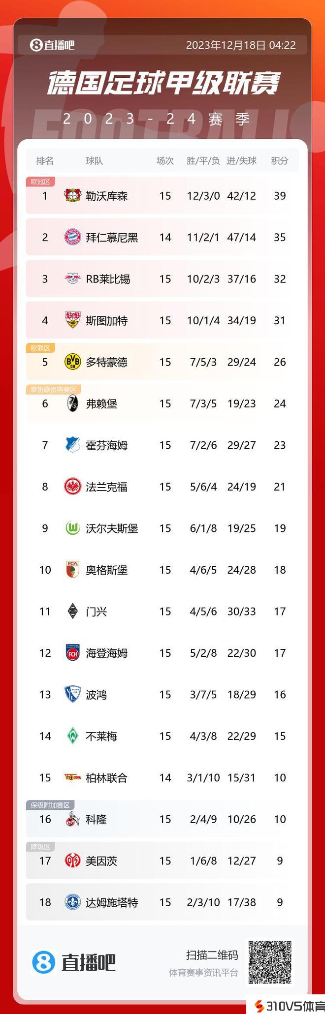德甲积分榜:勒沃库森4分优势领跑,拜仁少赛一场排第二&多特第五