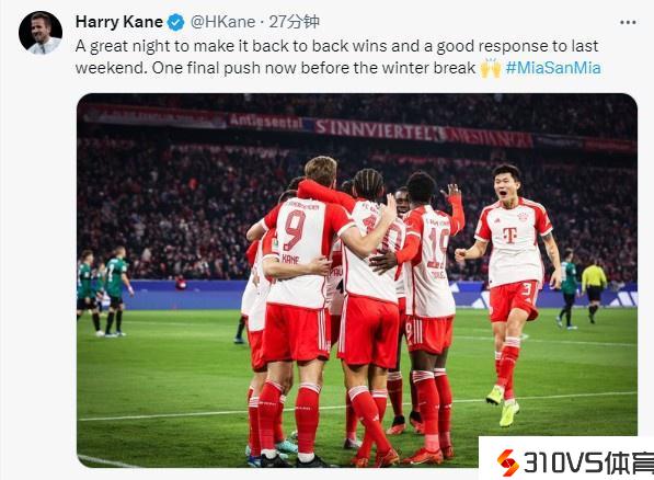 凯恩发推庆贺:这是一个很棒的夜晚 距离冬歇期只剩最后一场竞赛
