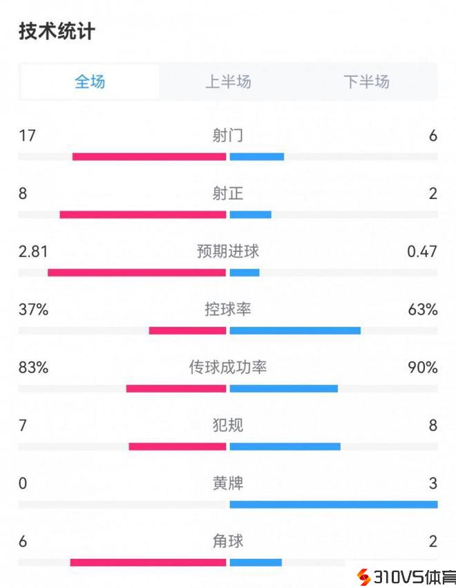 拜仁3-0斯图加特数据对比:射门17-6,射正8-2,控球率37%-63%