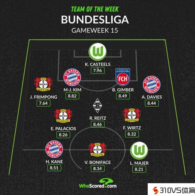 WhoScored评德甲第十五周最佳阵容:药厂四人中选,拜仁三人