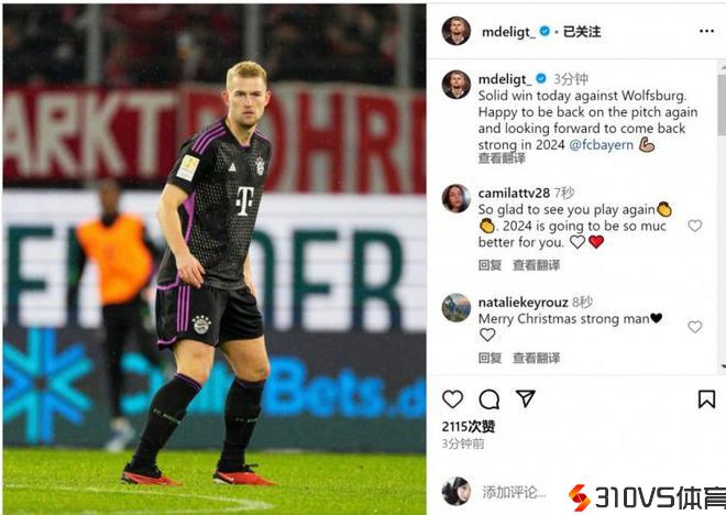 赛后德里赫特在社交媒体上晒出自己的竞赛照片,并写道:“明天对阵沃尔夫斯堡的坚实成功,很快乐能重返球场,等候在2024年强势归来!”