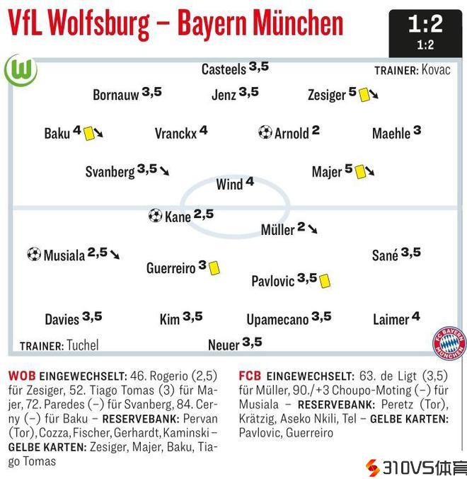 在德甲第16轮竞赛中,拜仁客场2比1击败沃尔夫斯堡,《踢球者》对两队球员停止了评分,穆勒、马克西米利安-阿诺德2分全场最高,凯恩、穆西亚拉2.5分。