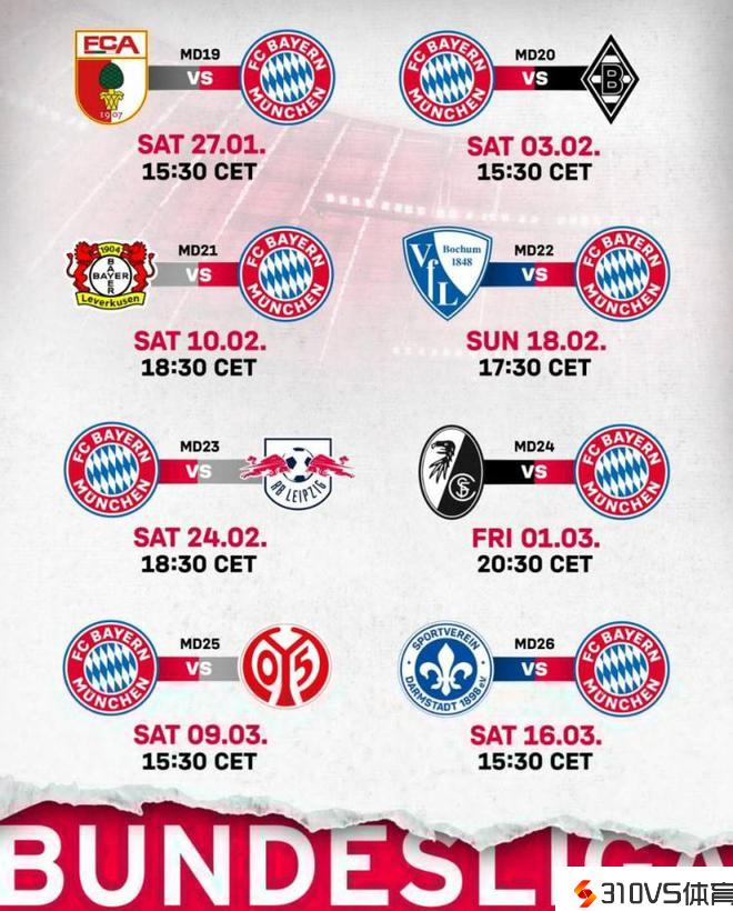 拜仁发布19到26轮赛程:2月10日客战勒沃库森,24日对阵莱比锡