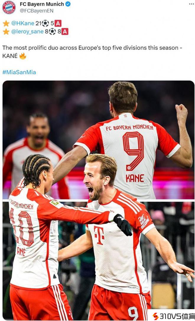 29球13助攻!拜仁官推晒凯恩+萨内德甲数据:本赛季最高产双人组