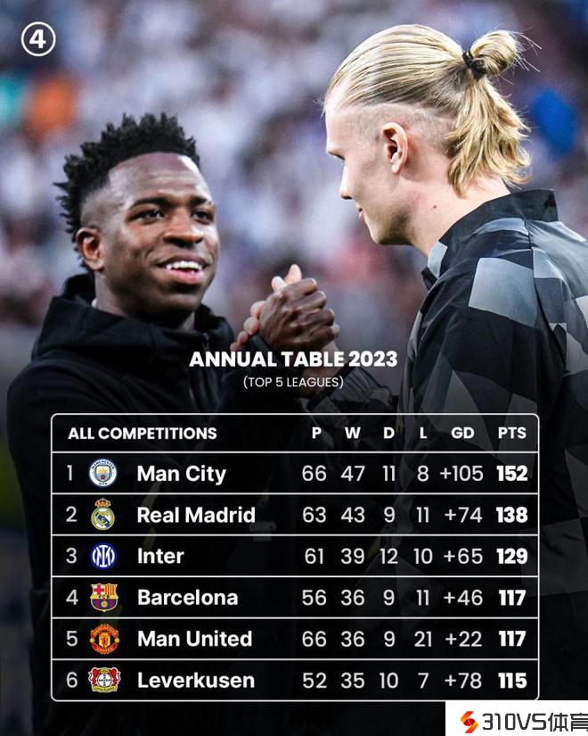 2023年度各项赛事积分榜:曼城、皇马、国米、巴萨、曼联前5