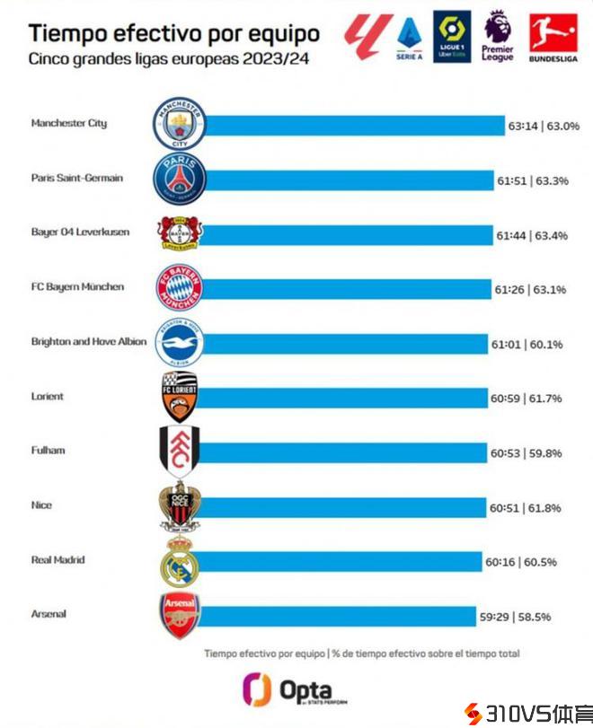 据OptaJose数据统计,曼城本赛季平均有效竞赛时长63分14秒,是五大联赛平均有效竞赛时长最长的球队,皇马平均有效竞赛时长60分16秒,是榜单前十中独一的西甲球队,意甲没有球队上榜。