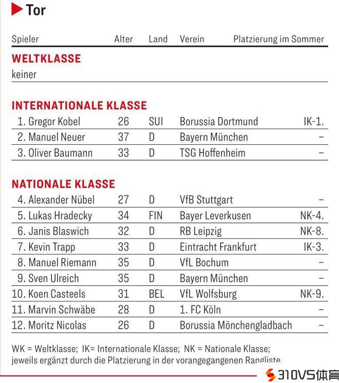 踢球者德甲半程门将评级:无世界级,科贝尔、诺伊尔、鲍曼国际级